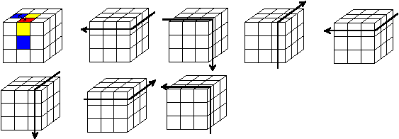 Die soeben vertauschten Kantensteine müssen nun noch richtig gekippt werden, d.h. so, dass ihre gelben Flächen immer oben sind (falls Gelb die Farbe der Unterseite ist, die zur Zeit nach oben zeigt). Dazu den Zauberwürfel wie folgt drehen: